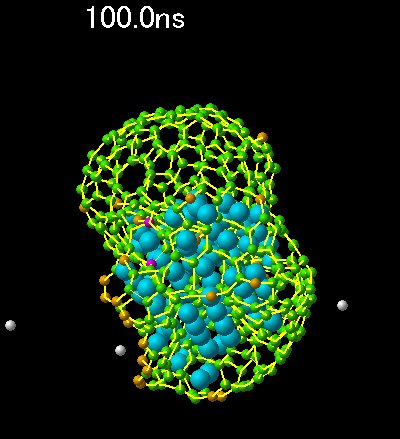 下記の分子動力学法シミュレーションは、炭化水素を用いた場合の触媒CVD
