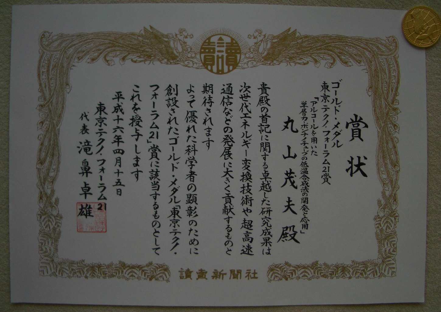 ゴールド・メダル「東京テクノ・フォーラム21」賞を受賞