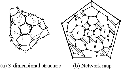 3.2 完全なフラーレン構造へのアニール 前節に示した計算条件は前報(34)と比較して低密度であるとはいえ,依然として実際のフラーレン生成環境と比較すると遥かに炭素原子密度が高い状態となっている.このため,他のクラスターとの衝突確率の低いC60,C70の程度のケージ状のクラスターに関しても,十分なアニール時間を与えられているとはいい難い.そこで,仮想的に十分なアニール時間を与えるため,ケージ状構造のC60クラスターに着目し,長時間に渡って衝突させずに高温状態に保持した.図2に初期条件として採用したケージ状構造のC60の三次元形状[図2(a)],及び図2(a)の太線で示した五員環の中心を軸に極座標変換し,平面表示したもの[図2(b)]を示す.ここで,図2(b)では最外周以外の五員環にハッチングを施し,ダングリングボンドを持つ炭素原子を白抜きにしてある.このクラスターは60個の孤立炭素原子のクラスタリングによって得られたものであるが(36),ケージ構造をとってはいるものの,図1の1900