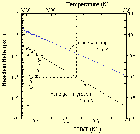 3.3 温度,時間スケールに関する考察 前節で長時間のアニールによりフラーレン構造の形成が可能であるということがシミュレートされたが,ここで用いた2500 Kという高温と約50 nsというアニール時間が現実的かということが問題となる.ここで注意するべき点は,フラーレン生成環境での温度は,レーザー蒸発法では1000〜2000 K,アーク放電法では約1000 K程度であると想像され,また1000 K程度以上の高温で長時間維持するとC60が解離してしまういわれている.本シミュレーションでは時間の仮想的圧縮と関連してアニーリング効率を上げるため,温度をかなり高く設定していると考えている.そこでこれらの時間スケールと温度の関係を評価するためC60の反応速度について考察を加えた.