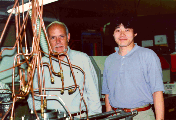 写真1 Rice大学Smalley教授の研究室で(左がSmalley教授,右が丸山,手前にアーク放電フラーレン生成装置の冷却用銅パイプが見える)