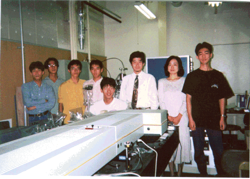 写真2 研究室のメンバー(左から,D1:山口,M1:畑江,学部:木村,学部:吉田,M2:林,丸山助教授,(庄司教授の)秘書:渡辺,M2:倉重).手前に波長可変レーザー,後ろにTOF質量分析装置がわずかに見える.