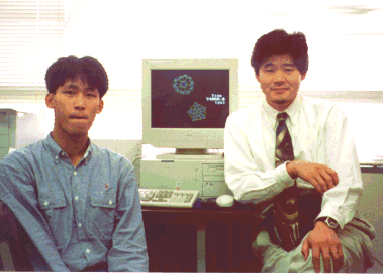写真3 フラーレン生成過程の分子シミュレーションの様子(左:山口君,右:丸山助教授,中央:パソコン上で完全にIh対称となったC60)