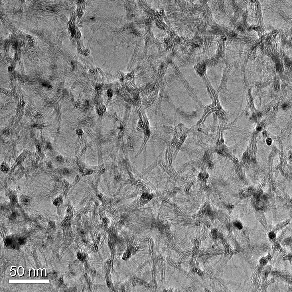 観察したTEM像.垂直に上を向け,5−6本前後で一束になった単層CNTが黒く見える.